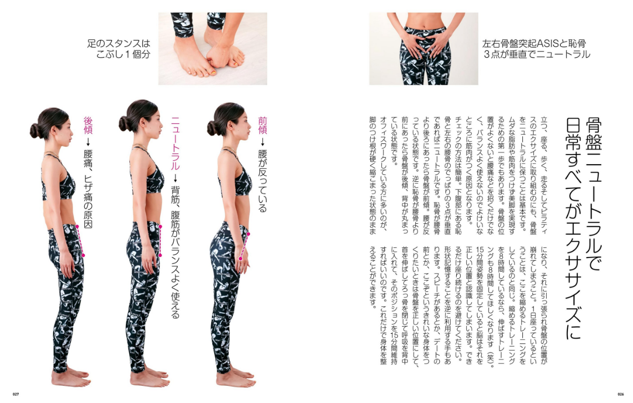日常をピラティスポジションで動くとエクササイズに変わる理論、実践的なピラティスエクササイズのポイントを紹介しています。